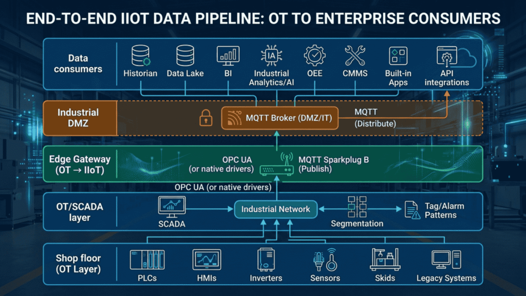 SCADA + rede industrial + segmentação + padrões de tag/alarmesEdge Gateway (OT → IIoT)